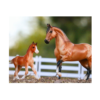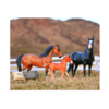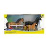 El juego incluye 3 caballos (semental, yegua y potro), 6 piezas de cerca, abrevadero, cubo de agua, bolsa de alimento y bolsa de alimento.